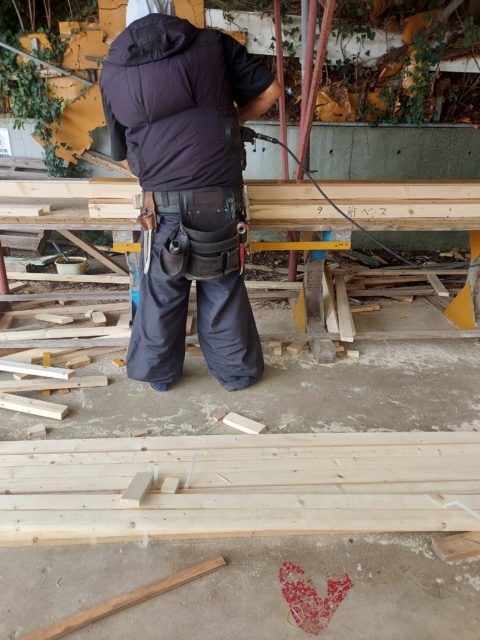 越谷市、型枠大工株式会社真尚です。今日は加工しました。まだまだ暑いので空調服着てます。