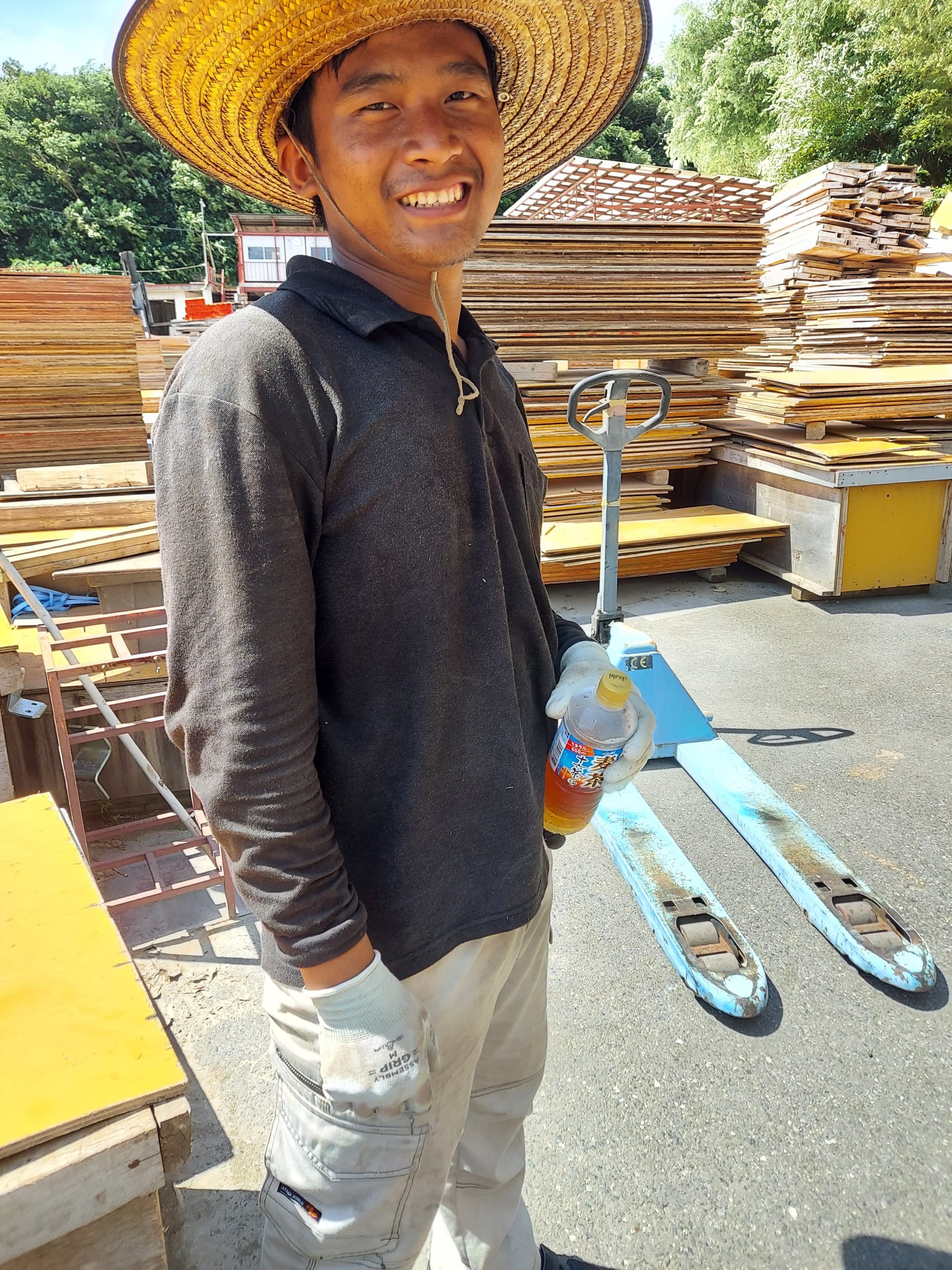 越谷市、型枠大工株式会社真尚です。今日は実習生は元請け会社の資材整理。麦わら帽子を借りて頑張ってます!